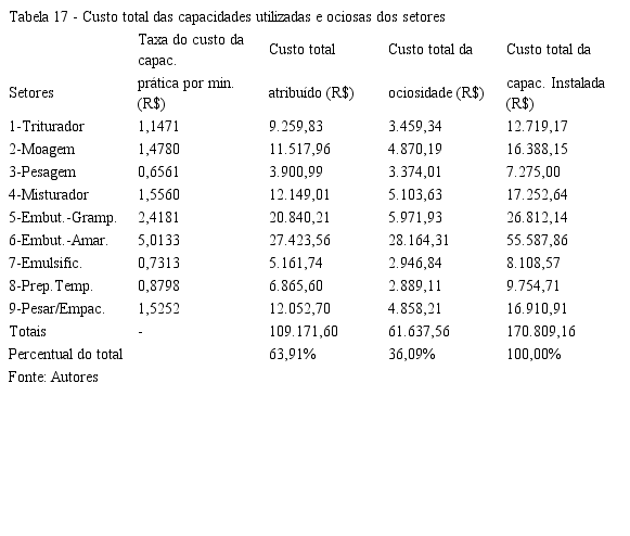 Como a taxa do custo de capacidade prática por minuto (em R$) dos setores já havia sido apurada (vide Tabela 11), foi necessário somente multiplicar esta taxa pelo tempo total disponível, utilizado e ocioso de cada setor (citados na Tabela 16) para obter os valores totais respectivos.