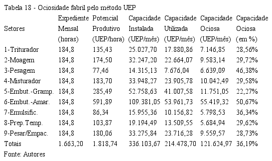 No que tange ao método UEP, a ociosidade fabril pode ser mensurada como demonstrado na Tabela 18.