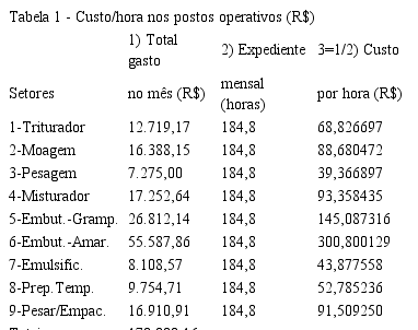 Então, para determinar o custo por hora de cada setor bastou dividir o gasto mensal pelo número de horas da jornada de trabalho, que era igual em todos segmentos desta linha de produção. No caso do setor 1-Triturador, o valor despendido de R$ 12.719,17 foi dividido por 184,8 horas, o que acarretou custo médio de R$ 68,83 a cada hora trabalhada.