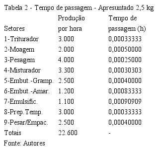 Nesse caso, para mensurar o tempo de passagem dos itens em cada um dos setores inicialmente foi apurado o volume médio de produção por hora dos produtos nas etapas fabris citadas.