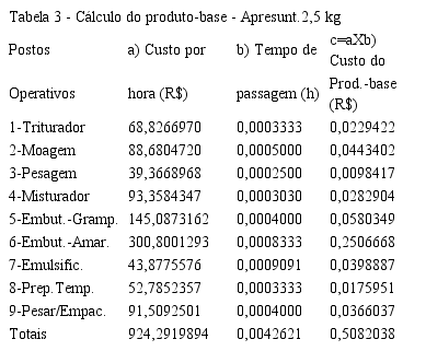 A fase seguinte do método UEP requer a definição do custo do produto-base, cuja escolha recaiu sobre o produto “Apresuntado 2,5 kg” e os cálculos respectivos estão expressos na Tabela 3.