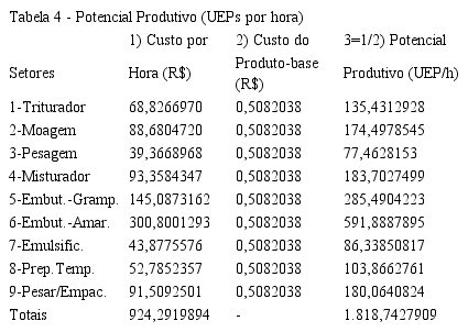 O referido valor é empregado na próxima etapa de cálculo, cuja finalidade é determinar o potencial produtivo em termos de UEPs/hora de cada setor ou posto operativo, nos moldes do delineado na Tabela 4.