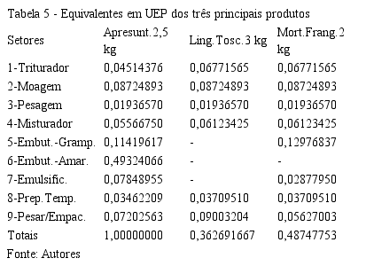 Os dados disponíveis até este ponto são suficientes para calcular o “Equivalente em UEPs” de todos os componentes do mix comercializado. Contudo, mesmo que o estudo tenha envolvido mais de uma centena de produtos fabricados no mês em tela, por restrição de espaço optou-se por evidenciar apenas três desses itens, como consta da Tabela 5.