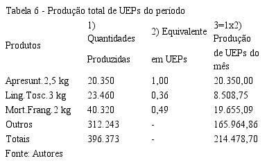 Para calcular a produção de UEPs do mês foi necessário levantar as quantidades produzidas de cada produto para, em seguida, multiplicar esses volumes pelos respectivos equivalentes em UEPs (calculados na Tabela 5). Com base nesse raciocínio concluiu-se que a linha de produção pesquisada fabricou no período 396.373 unidades de produtos, cujo montante equivalia a 214.478,70 UEPs.