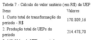 O custo total de transformação do período (R$ 170.809,16) já havia sido mencionado na Tabela 1 e a produção mensal de UEPs foi determinada nos moldes do salientado na Tabela 6. Então, este custo fabril do mês foi dividido pelas 214.478,70 UEPs fabricadas para chegar ao valor de R$ 0,7963922 por unidade de esforço de produção.