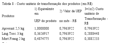 Na próxima etapa do UEP se faz a conversão dos equivalentes em UEP dos produtos para valores monetários, o que proporciona conhecer o custo unitário de transformação (em R$) de cada item enfocado no estudo. Nesse rumo, a Tabela 8 ilustra o procedimento de cálculo requerido para determinar o custo unitário de transformação dos produtos.