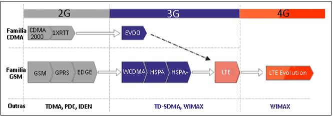 A tecnologia de banda larga móvel, também chamada de tecnologia de rede de longa distância sem fio, termo em inglês Wireless Wide Area Network (WWAN), fornece acesso de alta velocidade e sem fio à Internet por meio de dispositivos eletrônicos portáteis. Com a banda larga móvel, é possível se conectar à Internet em qualquer lugar onde haja serviço de celular disponível (Microsoft, 2013). A Figura 1 apresenta a evolução na tecnologia da banda larga móvel.