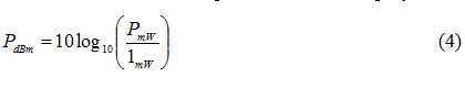 O nível de sinal, expresso em dBm (decibel miliwatt), representa um valor de potência que é emitido ou recebido por um equipamento, sendo esta medida utilizada principalmente em telecomunicações para expressar a potência absoluta mediante uma relação logarítmica. Define-se como o nível de potência em dBm a relação entre a potência em miliwats e o valor de referência 1mW, sendo expressa através da Equação 4.