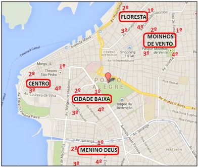 Em cada bairro as medidas de nível de sinal e taxa de download foram obtidas em quatro pontos diferentes como demonstra a Figura 6. A coleta ocorreu em dois dias úteis durante o mês de junho de 2014 no período entre 14:00h e 17:00h. Optou-se por coletar os dados neste período, pois teoricamente a demanda de uso da Internet é mais elevada em horário comercial.