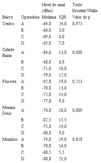 A Tabela 1 apresenta a Mediana (MD) e a amplitude interquartílica (IQR) para os níveis de sinal das quatro operadoras nos diferentes bairros. Dentro de cada bairro foi realizado o teste de Kruskal-Wallis.