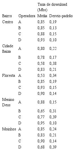 A Tabela 3 apresenta o resultado da ANOVA de dois fatores para a comparação das taxas de download por bairro e operadora.