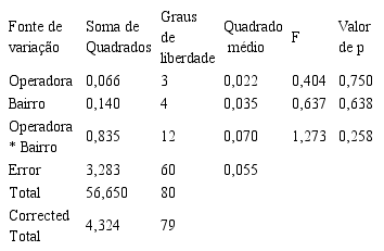O teste revela que não há diferença estatisticamente significativa entre as operadoras dentro dos cinco bairros investigados. Realizando a comparação entre os bairros, desconsiderando a operadora, o resultado não apontou diferenças entre eles (p=0,129). Da mesma forma, se as operadoras forem comparadas sem o efeito dos bairros também não foram encontradas diferenças significativas (p=0,128).