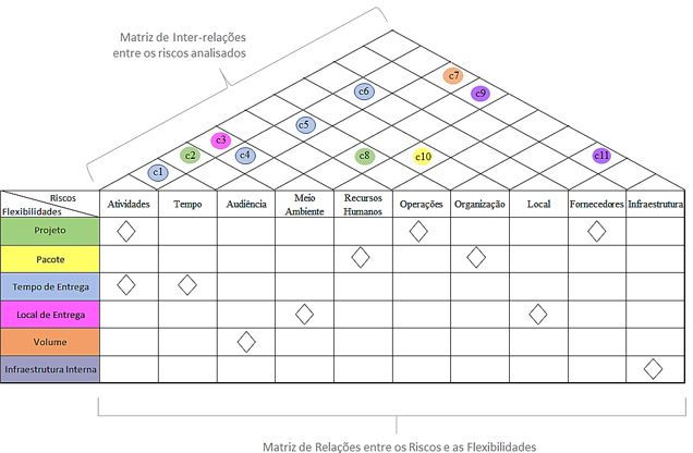 Outro resultado interessante encontrado, via análises realizadas, foi que os riscos se afetam mutuamente, isto é, um problema em determinado tipo de risco pode causar ou ser causado por desvios em outros riscos. Por exemplo, os problemas de infraestrutura e local podem estar relacionados ou um desvio no tempo pode acarretar mudanças nas atividades. A Figura 2 apresenta as correlações percebidas entre os riscos, as quais são exibidas na parte superior da figura. Nesta também está presente a Matriz de Relações entre os riscos e as flexibilidades. O risco de Plano de Emergência não está presente na figura, uma vez que todas as entidades utilizam a estratégia de controle para lidar com o mesmo.