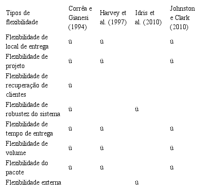 De acordo com Johnston e Clark (2010) , existem quatro formas básicas de flexibilidade operacional em serviços: flexibilidade do novo produto, flexibilidade do composto de produto, flexibilidade de entrega e flexibilidade de volume. Para Idris, Hassan e Rahman (2010) , a flexibilidade em operações de serviço pode ser dividida em robustez interna e flexibilidade externa. Harvey, Lefebvre e Lefebvre (1997), por sua vez, apresentam cinco dimensões para a flexibilidade: volume, tempo, lugar, projeto e pacote.
