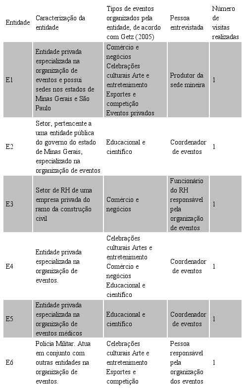 O quadro 2 apresenta uma síntese sobre as entidades organizadoras de eventos analisadas e especificações relacionadas à coleta de dados realizada. Para se manter o sigilo, cinco das entidades serão denominadas como E1, E2, E3, E4 e E5. A sexta entidade trata do setor responsável pela organização de eventos presente na 17ª Cia da Polícia Militar no Estado de Minas Gerais. No quadro 2 também é apresentada uma descrição breve sobre cada uma das entidades, os tipos de eventos organizados por elas e a pessoa entrevistada.