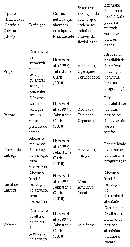 Como pode ser percebido, o trabalho de Corrêa e Gianesi (1994) é o mais abrangente em relação aos tipos de flexibilidades aplicadas ao serviço. Em consequência disto, este foi utilizado como base para as análises efetuadas neste estudo.