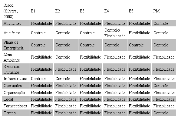 Dessa maneira, torna-se necessário haver flexibilidade para que, apesar dos riscos presentes e dos imprevistos que podem acontecer durante sua execução, o evento possa ocorrer da melhor maneira possível. Assim sendo, este trabalho tem como objetivo comparar táticas utilizadas pelos organizadores de eventos para, por meio da flexibilidade, lidar com os riscos existentes, durante a entrega do serviço em um evento e analisar as inter-relações entre os riscos presentes durante este processo.