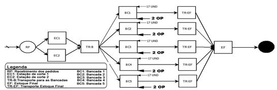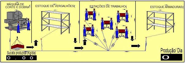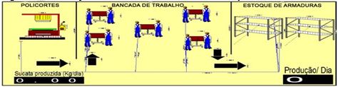 Conforme a figura 7, o setor de ferragem não dispõe de um estoque de vergalhões para uso na produção nos dias posteriores, visto que os vergalhões, cortados nas policortes, são para o uso na produção do mesmo dia; outro fator a ser levado em consideração é o uso de apenas 10 armadores, atuando em todo o processo produtivo. Nas etapas foram utilizados todos os dados coletados durante 45 dias, referentes a cada etapa do processo de produtivo de armaduras e utilizados no software de simulação, o Arena®.