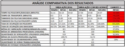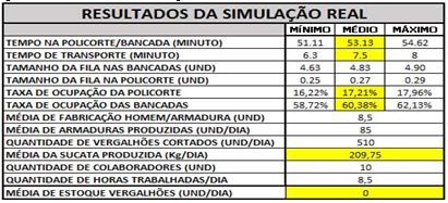 Tendo em vista a figura 10, a aplicação das propostas de melhorias feitas pelos pesquisadores, a disposição do estoque de vergalhões entre a máquina de corte e dobra e as bancadas de trabalho, centralização dos operadores em suas bancadas de trabalho e a adição de dois operadores na máquina de corte e dobra. Com base nos dados, foram feitas 2 simulações com melhorias no software Arena®, e todas as informações dos relatórios fornecidos no termino de cada simulação foram comparadas com a simulação do processo real, e seus resultados demonstrados no quadro 5.