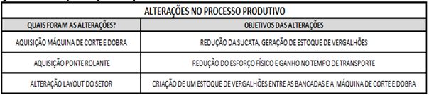 Nesta etapa apresenta-se o conjunto de alterações feitas no ambiente da empresa PREMOLDE, embasadas nos dados fornecidos pelos relatórios da simulação do processo real. Com base nessa situação foram propostas três melhorias, que visam impactar diretamente na produtividade e na qualidade do trabalho. Essas alterações juntamente com seus objetivos são demonstradas no quadro 4.