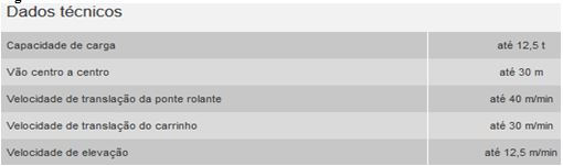 Conforme a figura 8, a máquina de corte e dobra utilizada foi uma Prima 12HS da marca Schnellbrasil (n.d.), esta possui as especificações necessárias para o preparo da matéria-prima utilizada na fabricação das armaduras, como as bitolas do aço que serão utilizadas, a velocidade de corte dos vergalhões e a precisão milimétrica no tamanho dos vergalhões. Na figura 9 são elencados os dados técnicos da ponte rolante.