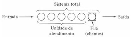 As filas estão presentes nos diversos setores da vida, estas não são exclusivas só do homem: estão presentes também dentro de processos mecânicos, processos lógicos, dentre outros. Taha (2008, p. 247) define filas como “um estudo que trata da quantificação do fenômeno da espera em filas usando medidas representativas de desempenho como o comprimento médio de uma fila, o tempo médio de espera em fila e a média de utilização da instalação”. Com fulcro nessa situação, Shamblin e Stevens (1979, p. 206) demonstram pela Figura 1 os elementos principais de um sistema de filas de espera.