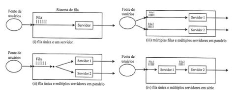 Os autores descrevem na figura 2 quatro tipos de classificação para o sistema de filas, a saber, fila única em um servidor; fila única com múltiplos servidores em paralelo; múltiplas filas e múltiplos servidores em paralelo; fila única e múltiplos servidores em série.
