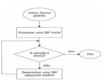 Na Figura 3 os autores demonstram o fluxograma do algoritmo Simplex, dividindo o método em quatro etapas: O Início, onde o problema deve estar na forma padrão; encontrar uma solução básica factível (SBF) atribuindo valores iguais a zero às variáveis de decisão; teste de otimalidade, uma SFB é ótima se não houver soluções básicas factíveis adjacentes melhores; iteração, determinar uma SBF melhor.