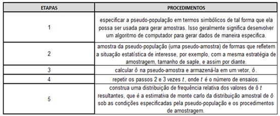 No entanto, Shamblin e Stevens (1979, p. 175) afirmam que a velocidade das operações no computador é importante para o uso dos modelos de simulação de Monte Carlo, pois, sem esta, boa parte dos modelos não poderiam ser praticados. No entendimento de Mooney (1997, p. 4), existe uma estratégia mais simples para se elaborar um modelo de Monte Carlo: basta criar uma "palavra" artificial, ou pseudopopulação, que se assemelha à palavra real em todos os aspectos relevantes. O autor demonstra no Quadro 1 cada etapa de seu procedimento.