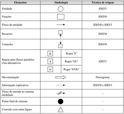 Pinho, Leal, Montevechi e Costa (2009) afirma que a partir do instante em que um analista desenvolve o problema para si, o conceito ainda se mantém abstrato, deste modo, existe a necessidade de usar um método de representação para que as ideias possam se alinhar, permitindo que outras pessoas possam compreender de forma mais coerente possível o que está sendo delineado e para torna-lo ainda o mais concreto possível da realidade. Desta forma, que Leal, Almeida e Montevechi (2008), surgiram com a técnica IDEF-SIM (Integrated Definition Methods – Simulation), método no qual seu foco principal é a simulação de sistemas, entretanto, esta é exclusivamente disposta a ser utilizada em projetos de melhoria de modo geral. A técnica IDEF-SIM, também tem como meta principal dispor de suporte exclusivo para a modelagem conceitual em projetos de simulação. O Quadro 2 demonstra de forma complexa os itens e simbologias utilizados no IDEF-SIM, assim como as técnicas primárias que foram adaptadas as necessidades da modelagem conceitual de projetos de simulação.