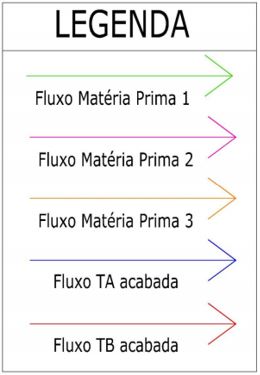 Algumas máquinas de TB estão localizadas separadas das outras máquinas, o que ocasiona o aumento do fluxo da matéria prima, e o cruzamento do fluxo de peças de TB prontas para o estoque com o de materiais, conforme figura 5. Outro ponto de melhoria, é que no início do setor de montagem o fluxo de matéria prima 3 cruza com o fluxo de peças de TB para o setor de TA e com o fluxo de peças de TA prontas para o setor de montagem, gerando uma grande movimentação em um pequeno espaço e consequentemente pode ocorrer estresse nos funcionários e acidentes de trabalho.