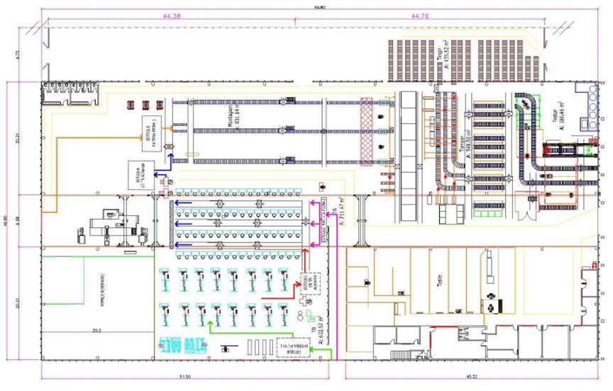 O layout proposto apresenta uma solução viável para o fluxo cruzado de matéria prima dos setores e produtos acabados para o próximo setor que dependa desse produto, como por exemplo, a peça de TB acabada para o setor de TA e assim por diante, que é considerado um dos maiores problemas do layout atual e a distância entre os setores gerando movimentações excessivas.