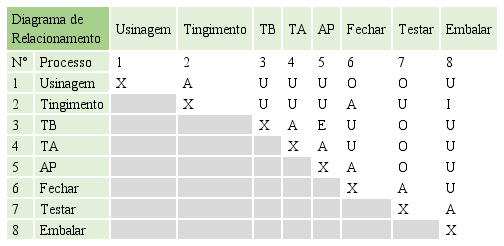 Com os dados obtidos através do fluxograma apresentado na Tabela 1 foi possível realizar o diagrama de relacionamento de atividades, onde foi definido quais operações necessitam de proximidades e quais não necessitam, sendo utilizado para isso algumas siglas que definem o grau de proximidade requerido, conforme é apresentado abaixo: