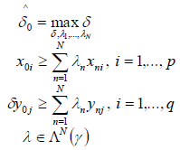 (3)The DEA models can be oriented by inputs, when the purpose is reducing inputs, keeping the outputsconstants, or oriented by outputs, when the goal is to increasing outputs, fixing the inputs. The second one model will be adopted in the present paper and the efficiency score,