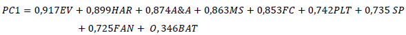 The PC1, given by (5), can be understood as a vector of items weights linked to the samba schools overall performance. Because they have the highest coefficients, the valid scores sum of the EV, HAR and A&A are the three most important variables (Mingoti, 2004) of PC1. The eigenvectors, which are composed of coefficients that correspond to each variable, are used to calculate the scores of the major components. The coefficients indicate the relative weight of each variable in the component (Mingoti, 2004). Therefore, these were considered as outputs.