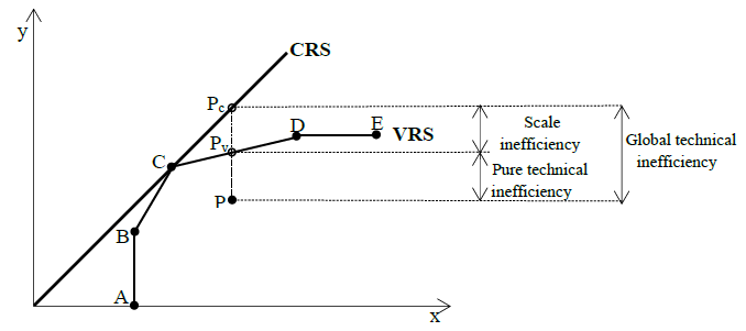 The Figure 1 illustrates geometrically the presented concepts. For this, it is considered an input and an output and a model based on an outputs orientation. In this way, the efficient limits calculated by the DEA model are presented under the constant return to scale (CRS) assumptions, to which DMU C belongs and the variable scale returns (VRS), consisting of the DMUs A, B, C, D and E. The last one contains a part with non-decreasing scale returns (A to C) and one with non-increasing scale returns (C to E). Realize that the DMU P does not belong to those borders, therefore, it is inefficient. Under the assumption of constant scale returns, the global technical inefficiency of P is characterized by the distance PPc. By the oder hand, under the assumption of variable returns to scale, the pure technical inefficiency of P is designed by the distance PPv. The difference between these two techniques, given by the distance PvPc, it is called by the scale inefficiency of P.