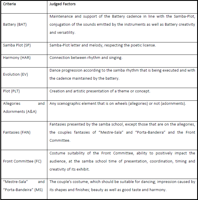 Costa, J. F.S., Silva, B. B., & Ramalho, C. G. (2010). Critérios de julgamento dos quesitos das escolas de samba do grupo especial do Carnaval do Rio de Janeiro:uma análise multicritério. Pesquisa Operacional para o Desenvolvimento, 2(2), 100-118.