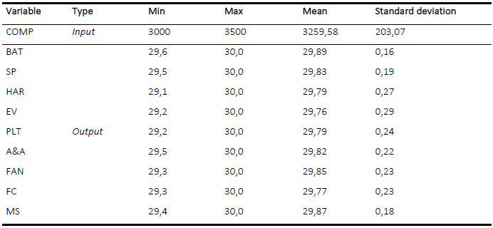In order to select the three most relevant outputs it was used the Principal Component Analysis (PCA) technique, which aims to explain a random vector: variance and covariance structure, composed of random p-variables, by constructing some linear combinations of k (k < p) original variables - the main components - not correlated with each other (Hongyu, Sandanielo & Oliveira Júnior, 2016). Thus, from the original variables set, initially correlated, it is possible obtain a substantially smaller set of uncorrelated variables that contain most of the information.