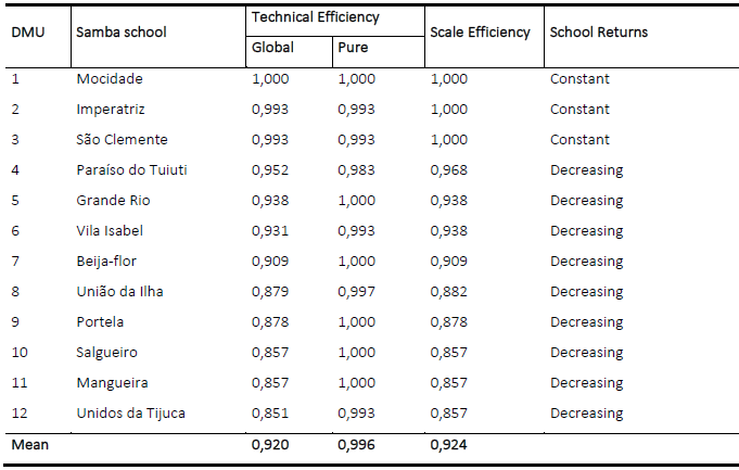 The present research showed that the DEA technique can be useful to measure the technical and scale efficiencies of samba schools. It was verified that only one samba school inserted on the special group of Rio de Janeiro Carnival in 2017, Mocidade, had the global technical efficiency. It was also found that, although Grande Rio, Beija-Flor, Portela, Salgueiro and Mangueira, as well as Mocidade, presented pure technical efficiency, the average global technical inefficiency was 8%.