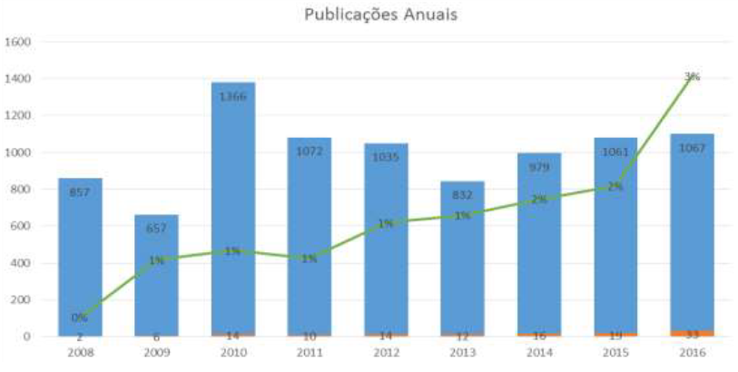 Outros resultados expressivos que foram encontrados são: apesar da baixa quantidade de artigos que usam bibliometria para estudo, observa- se um crescente volume nos últimos anos, sobretudo no ano de 2016 onde houve praticamente o dobro, em números absolutos, de artigos sobre o assunto, além da observação da discrepância entre a utilização da bibliometria nas grandes áreas de Engenharia de Produção, o que pode sugerir que algumas áreas já possuem o domínio e se utilizam de tal técnica como suporte para o desenvolvimento de trabalhos acadêmicos, enquanto outras áreas como Pesquisa Operacional e Ergonomia não o fazem. Uma pesquisa mais aprofundada se faz necessária para entender o real motivo para a baixa frequência de pesquisas nessas áreas, porém é importante enfatizar que a bibliometria pode trazer muitos benefícios para tais áreas, uma vez que agrega qualidade de conhecimento.