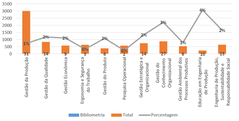 Também é importante ressaltar o maior volume de artigos sobre bibliometria na área de Gestão da produção, mostrando que, além de ser uma área de grande fonte de pesquisa em Engenharia de Produção como um todo, especialmente nas subáreas de Logística e Cadeia de suprimentos, essa também tem sido uma área onde seus pesquisadores utilizam a bibliometria com maior frequência.