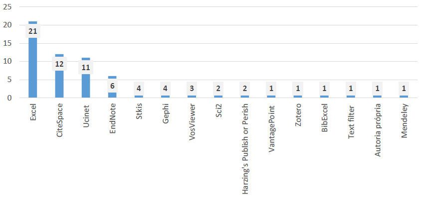Dos 137 artigos analisados, somente 78 citam a utilização de softwares de apoio para a elaboração da análise bibliométrica, cujo detalhamento é evidenciado na Figura 3. Constata-se que a grande maioria, utiliza-se de planilhas de Excel e gráficos gerados na própria base de pesquisa.