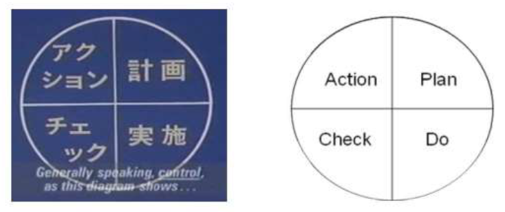 Fonte: Adaptado de Moen & Norman (2006)Segundo Moen & Norman (2006) Imai não forneceu nenhum detalhe sobre quem e como os executivos japoneses traduziram a roda de Deming para o ciclo PDCA (Figura 2). O ciclo de quatro etapas para a resolução de problemas inclui o planejamento (definição de um problema e uma hipótese sobre possíveis causas e soluções), fazendo (implementando), checando (avaliando os resultados) e agindo (de volta ao plano se os resultados forem insatisfatórios ou padronização se os resultados forem satisfatórios).