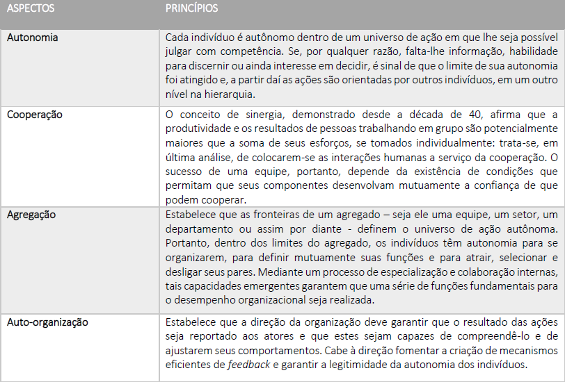Para Esteves (2003), a administração complexa pode ser compreendida através de quatro aspectos chaves: autonomia, cooperação, agregação e auto-organização. A abordagem destes aspectos cria condições propícias para o atendimento do desempenho desejado, conforme demonstrado no Quadro 1.