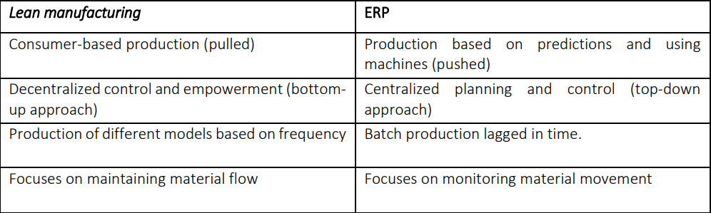 Lean manufacturing and ERP systems are considered two of the strategies used in companies in order to improve their performance, but there is a paradox that is discussed by the authors Powel and Strandhagen (2011), as shown in Table 1.