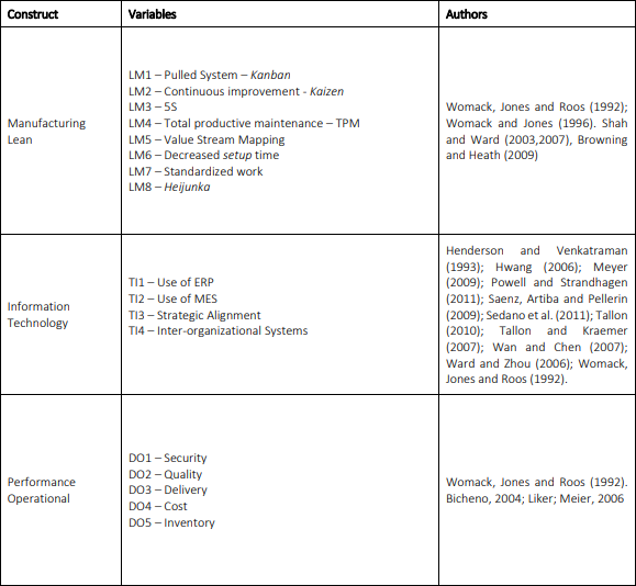 From the theory review, a referential framework was devised for the development of field research. Table 2 presents the variables that were researched, considering three constructs: Lean Practices, Information Technology, and operational performance.