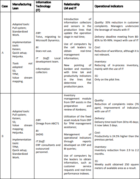 According to Riezebos, Klingenberg and Hicks (2009), the lean manufacturing and information technology approaches are increasingly interdependent and complementary and can bring a difference in terms of performance. The cases analyzed indicate that IT aided the implementation of lean manufacturing practices, which leveraged some of the companies' operational indicators.
