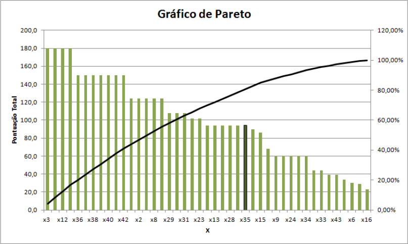 Após concluir a matriz causa-efeito, os “X” foram ordenados de acordo com a pontuação total, foi calculado o percentual de cada “X” e, posteriormente, o percentual acumulado, para que fosse plotado o Gráfico de Pareto, para que fossem priorizadas 80% das causas, conforme Figura 9.