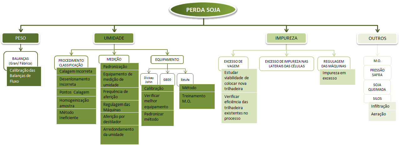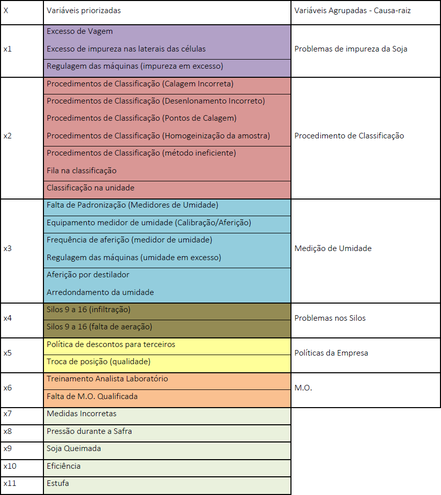 O Quadro, ilustrado anteriormente, apresenta o agrupamento das variáveis. Primeiramente, as variáveis estavam classificadas de acordo com o percentual acumulado e, posteriormente, foram agrupadas conforme a causa-raiz principal de cada variável para que, dessa forma, fosse possível avaliar os próximos passos a serem estabelecidos, medindo e avaliando a interferência de cada causa-raiz na perda final de soja.