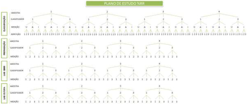 Para analisar a viabilidade do sistema de medição de umidade, foi idealizado um plano de medição, para analisar o RR da medição. Como diferentes setores da empresa (classificação, secadores, fábrica e laboratório) realizam a medição de umidade por sistemas de medição diversificados, optou-se por realizar um plano cruzado, onde seriam analisados os diferentes aparelhos de medição, bem como os diferentes operadores que utilizam o mesmo aparelho. Desta forma, o plano de medição ficou estabelecido, conforme Figura 11.